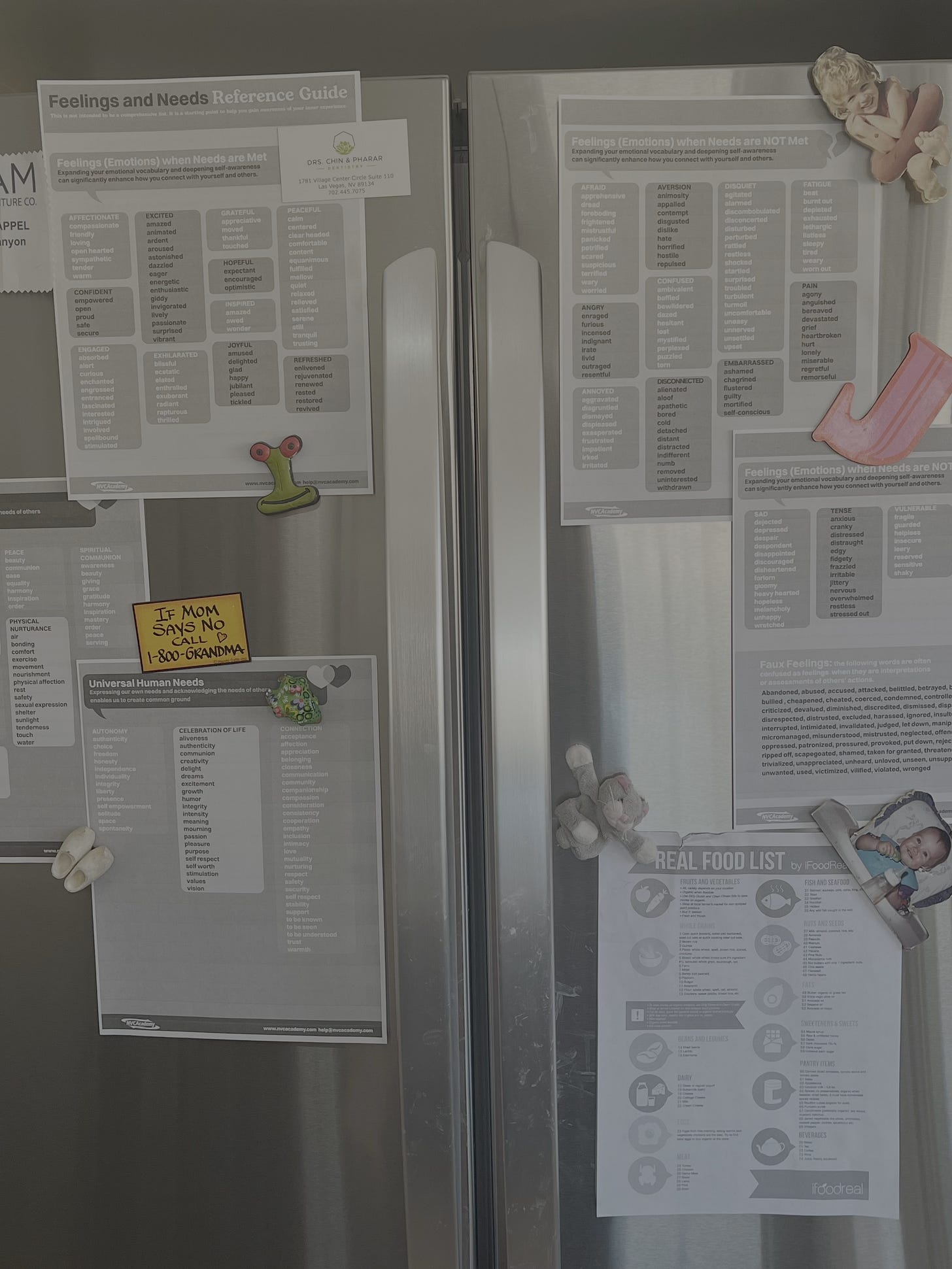 Now, taped to the fridge right above our "Real Foods" list is a new list—a word list. It is a reference guide to actual feelings—real, in-the-body emotions. Words like joyful, calm, grateful, excited, hurt, discouraged, tense, and vulnerable—not faux feelings like "attacked" or "ignored," which are judgments in disguise.